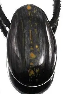 Diese aus schönem Hypersthen gefertigten Steine haben eine tropfenartige Form und wurden oben mit einem gebohrten Loch versehen, womit sie gut als Kettenanhänger, z.B. an einem Lederband getragen werden können. Ihre Größe entspricht etwa 2 - 3 cm und der Durchmesser der Bohrung beträgt etwa 3 mm.