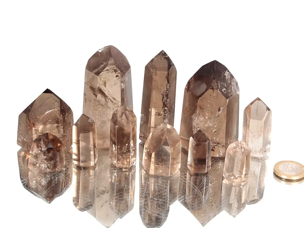 Dadurch sieht man besser in ihr Inneres. Diese Rauchquarze haben unterschiedlich dunkle und helle rauchige Farben und stammen aus Bahia in Brasilien. 100 % Natur und wurden garantiert nicht behandelt (bestrahlt). Höhe von ca. 2 bis 9 cm. Herkunft: Bahia / Brasilien