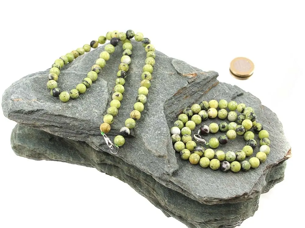 Der grün/gelbliche Stein mit weißlichen (Chrysotil) und schwarzen Einschlüssen (Magnetit) ist unverwechselbar. Da der Lizardit ein sehr weicher Stein ist, sind trotz der gewissenhaften Bearbeitung