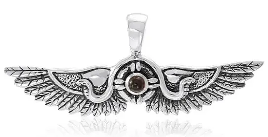 Horus, ein ägyptischer Hauptgott für Himmel und Licht. Dargestellt als Falke, symbolisiert mit seinen Flügeln seine einzigartige Stellung im Himmel. Seine ausgebreiteten Schwingen überragen den Träger und bieten Schutz vor äußeren Einflüssen. Zudem soll der kleine, in der Mitte eingelassene, Granat Edelstein zu einer Stärkung des Selbstbewusstsein beitragen.