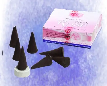12 Kegel. Der Duft ist angenehm rosig mit einem Hauch der (Nag) Champablüte. Zum Entspannen und Wohlfühlen. Inhalt: 12 Kegel (3x1cm) mit Halter in Karton (6x7cm) der Marke Nag Champa. Beim Abbrennen bitte an feuerfeste Unterlage denken.