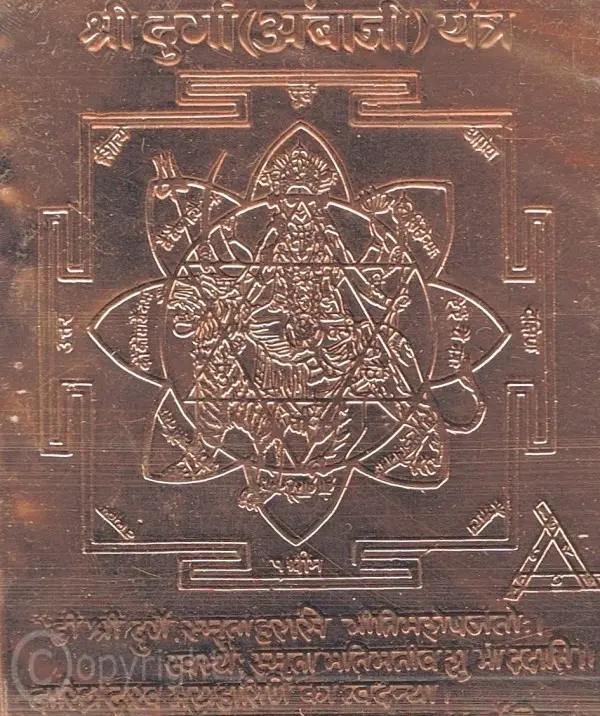 ...Das größte Fest zu Ehren der Göttin ist die Durga Puja und wird nach dem hinduistischen Mondkalender Ende September oder im Oktober gefeiert. Durga Yantra aus Kupfer