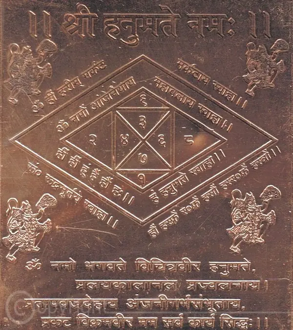 ...Dem Ramayana zufolge kann niemand Hanuman an Kraft, Sanftmut und Klugheit übertreffen. Er verkörpert den Idealtyp des Dieners und steht für Treue, Hingabe und Gehorsamkeit gegenüber dem Herrn....Sein wichtigster Feiertag ist Hanuman Jayanti, was als sein Geburtstag gilt und nach dem hinduistischen Mondkalender im März/April gefeiert wird. Hanuman Yantra aus Kupfer