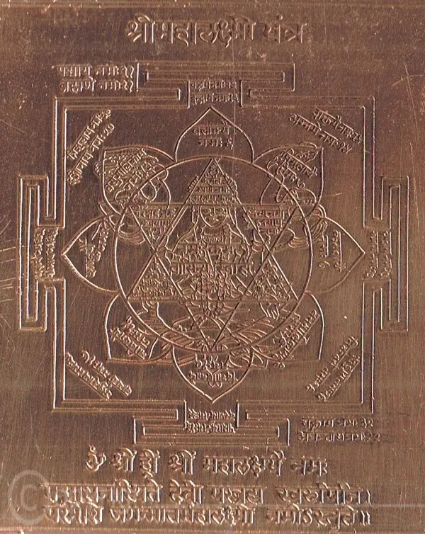 ...Von Lakshmi heißt es, dass sie nie lange an einem Ort verweilt und sich nicht halten lässt. Will man sie mit Gewalt besitzen und festhalten, so verlässt sie den Übeltäter sofort. ...Der dritte Tag des in Indien überaus populären Diwali- oder Lichterfestes ist der Göttin Lakshmi geweiht, bei dem man ihr zu Ehren Tausende von Laternen und Kerzen anzündet, Feuerwerkskörper abbrennt und die Häuser hell erleuchtet. Man spielt und feiert, während die Göttin von Haus zu Haus wandert, um einen Rastplatz zu finden. Sie komme aber nur in die hell erleuchteten Wohnstätten und bringe ihnen Glück fürs kommende Jahr. Dabei wird Lakshmi besonders von den Kaufleuten und Händlern verehrt. Im Dorf wird ein Misthaufen oder ein Haufen aus Kuhdung als Lakshmi gepriesen. ...Diwali beginnt immer am fünfzehnten Tag des Hindumonats Kartik (Ende Oktober/Anfang November), Lakshmi Yantra aus Kupfer