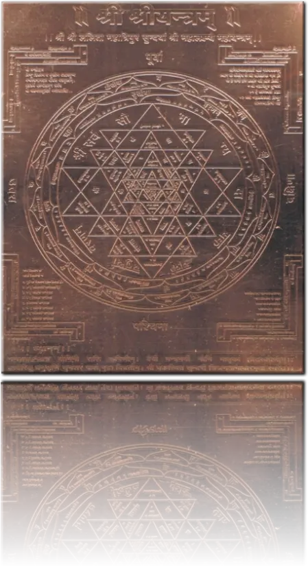 ca. 12 x 15 cm Shri-Yantra aus Kupfer Das Shri-Yantra als Sinnbild der kosmischen Schöpferkraft schwingt in allem und durch alles. Es durchdringt die verschiedenen Seins-Ebenen, harmonisiert und inspiriert. Astrologische Zuordnung und Bedeutung: galaktisches Zentrum, Ketu, Sternzeichen Schütze
